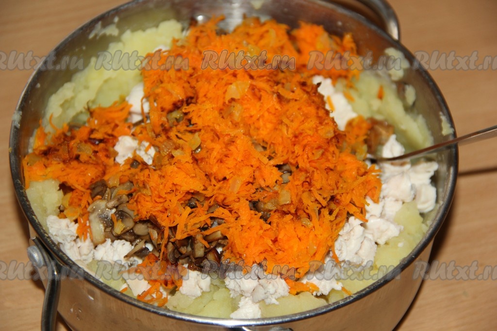 Тщательно перемешать картошку с курицей, шампиньонами и овощной зажаркой, посолить по вкусу.