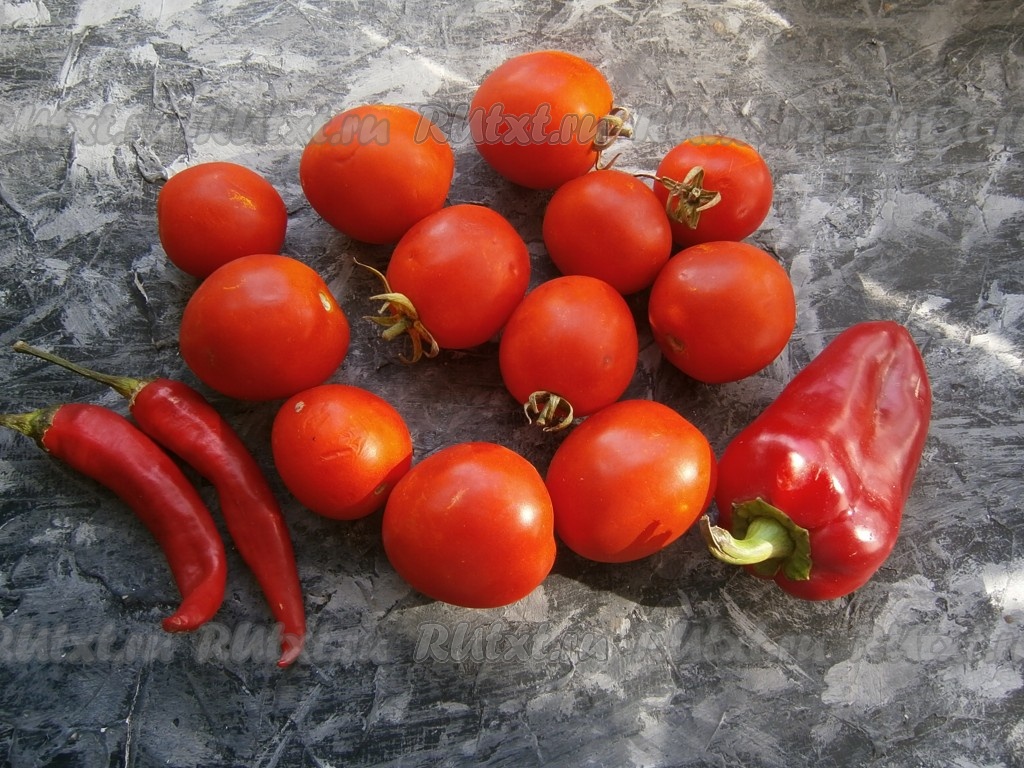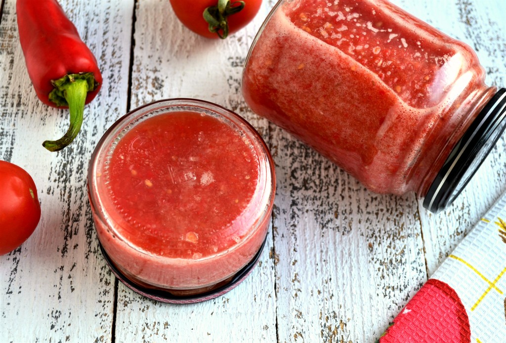 Помидоры вымыть, разрезать пополам и натереть на крупной тёрке так, чтобы кожица осталась в руках (её нужно выбросить). Можно помидоры залить кипятком на 3-5 минут, после чего снять кожицу и натереть их на тёрке или измельчить в блендере или мясорубке. К томатному пюре добавить измельчённый перец с чесноком, всыпать соль, сахар и влить уксус.