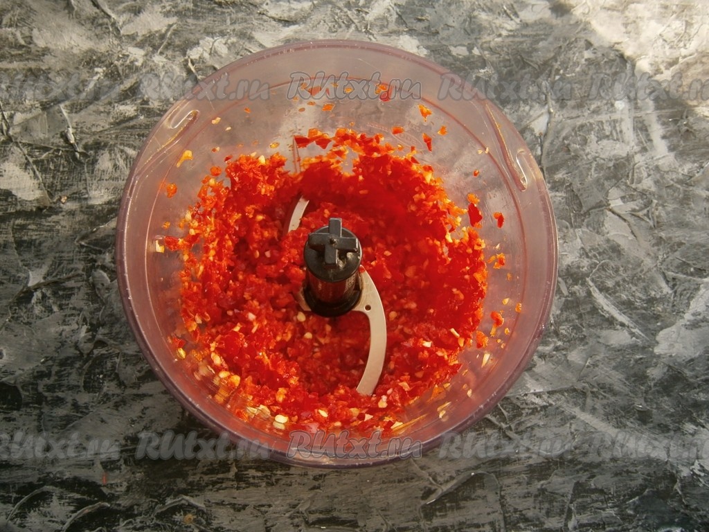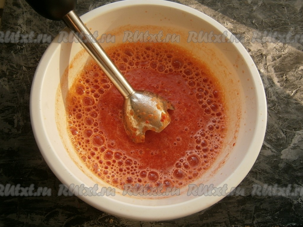 Перемешать получившуюся массу и пробить погружным блендером в течение 2-3 минут. Острый соус чили приобретёт нежную и бархатистую структуру.