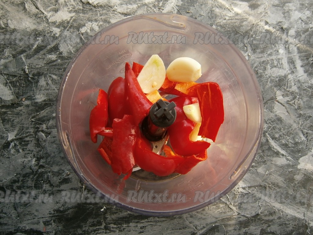 Болгарский перец очистить от семян, острый перец, по желанию, можете оставить с семенами. Нарезать острый и болгарский перцы, поместить в чашу блендера, сюда же добавить и очищенный чеснок.