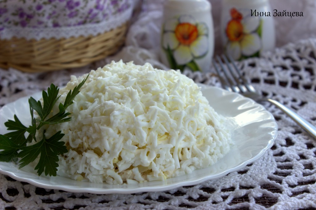 Завершающим слоем выложить белки, натёртые на средней тёрке.