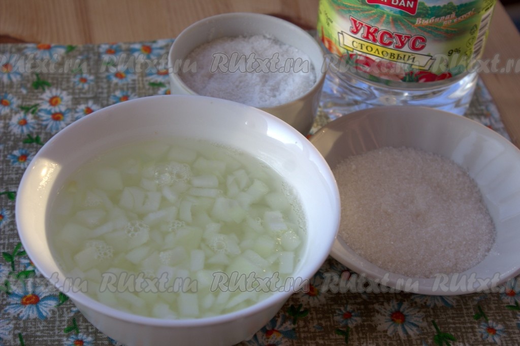 Очищенный лук нарезать небольшими кубиками и выложить в салатник подходящего размера. Влить к луку уксус, добавить сахар (по желанию, можно добавить щепотку соли) и кипяток, перемешать и оставить мариноваться минут на 30.