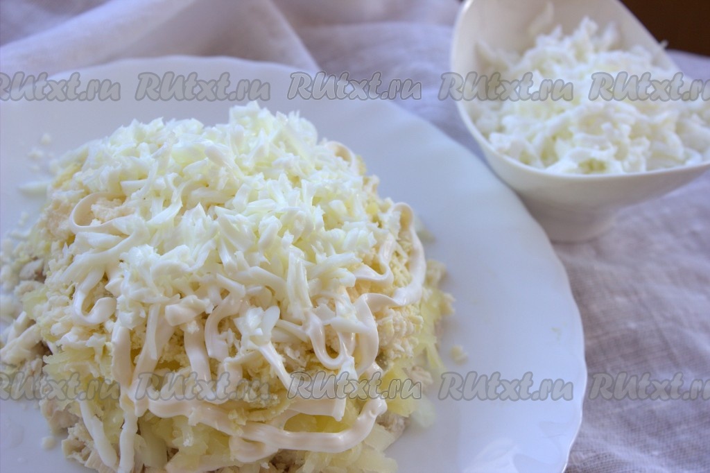 Хочу предложить рецепт очень вкусного и интересного праздничного салата "Невеста" с плавленным сыром и варёной курицей. Все компоненты в этом блюде прекрасно сочетаются, создавая великолепный вкус. Маринованный лук делает салат более пикантным. А плавленный сыр и яичные белки дарят блюду восхитительный белоснежный цвет и необыкновенную нежность. Обязательно приготовьте этот очень вкусный, нежный и сытный салат! Уверена, он станет центром внимания на праздничном столе!