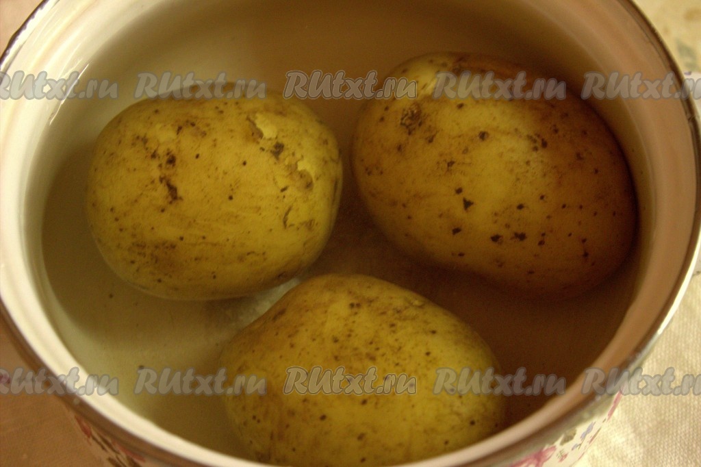 Тщательно вымытый картофель, не очищая от кожуры, сложить в кастрюлю подходящего размера, залить водой и поставить вариться. Когда вода закипит, уменьшить огонь, накрыть кастрюлю крышкой и варить картошку до готовности (25-30 минут, картошка не должна развариться). Чтобы убедиться, что картошка готова, нужно проткнуть её вилкой (или ножом), если клубень легко прокалывается, значит картофель готов. С готовой картошки слить воду, дать остыть.
