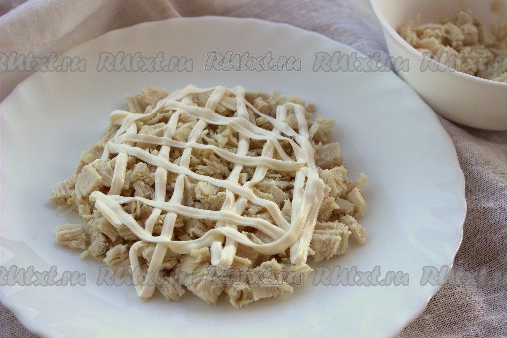 На плоское блюдо первым слоем выложить нарезанное куриное филе, сделать майонезную сеточку.