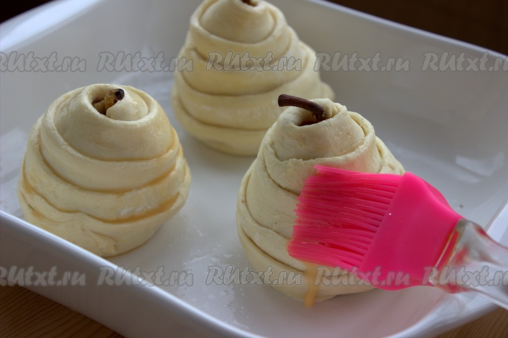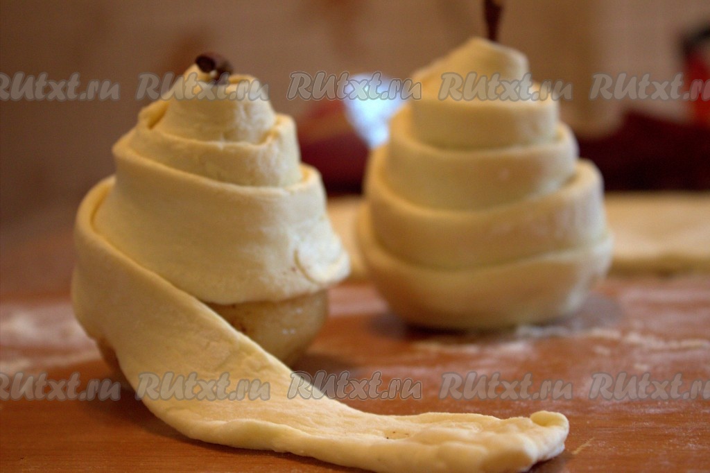 Слегка растягивая полоски из теста, обернуть их вокруг остывших груш, начиная от плодоножки (как показано на фото), закрепляя тесто у основания груши.