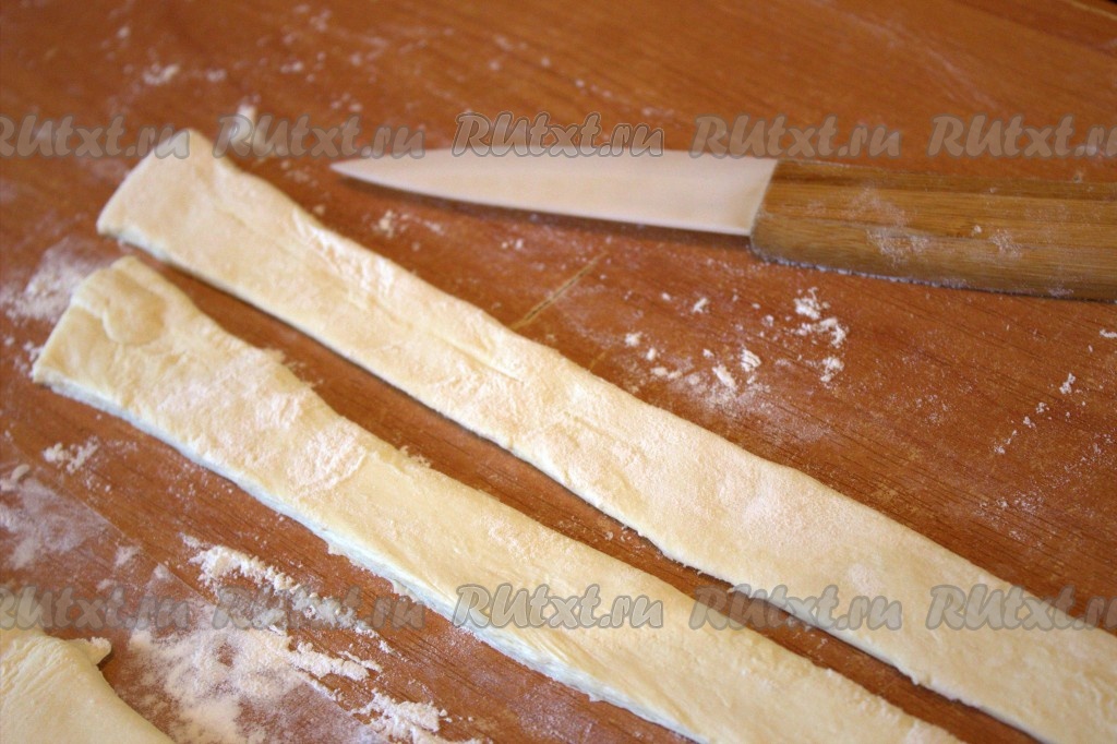 Разморозить слоёное тесто при комнатной температуре. "Припылить" мукой рабочую поверхность, выложить размороженное слоёное тесто и раскатать его в одном направлении, нарезать на длинные, узкие полоски шириной 1,5-2 сантиметра.