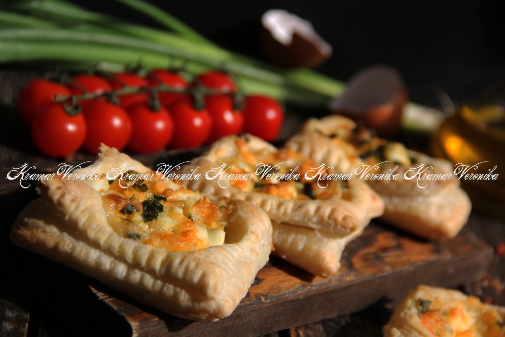 Готовые слойки с начинкой из зелёного лука и яиц подавать с пылу с жару. Очень вкусная и красивая выпечка получилась!