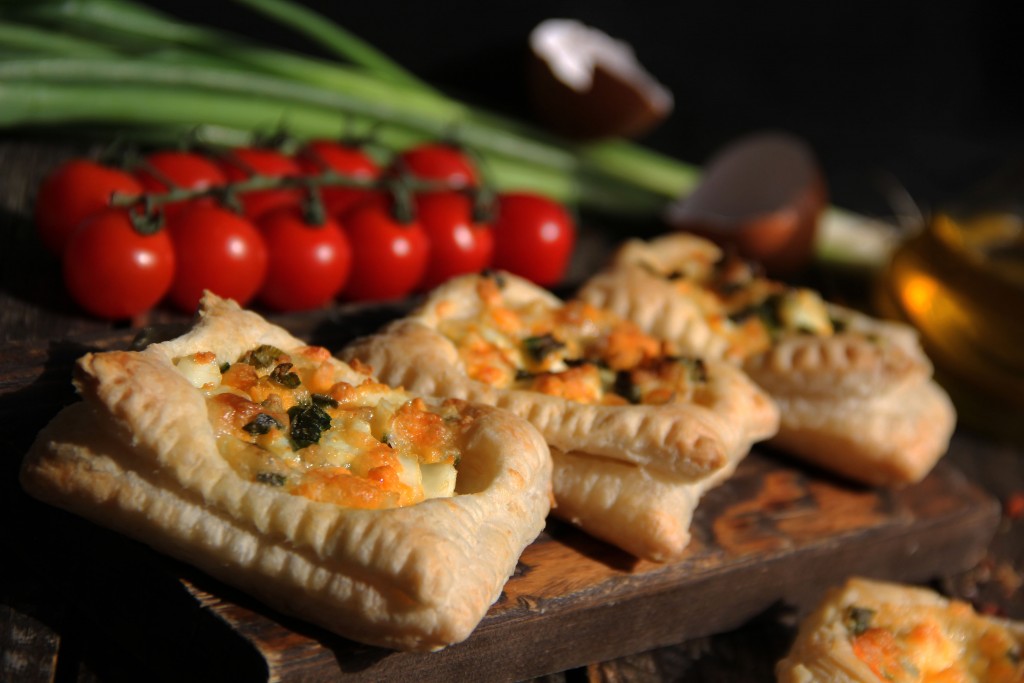 Положить начинку из зелёного лука, яиц и сыра в углубления слоек. Я начинку выкладывала с горкой. Выпекать пирожки из слоёного теста в разогретой духовке, примерно, 25 минут при температуре 180 градусов.