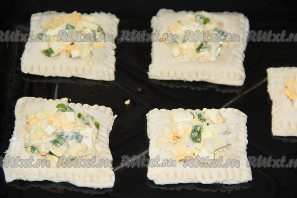 Разморозить слоёное тесто при комнатной температуре. Яйца сварить в течение минут 10 с момента закипания воды, а затем остудить, очистить от скорлупы и мелко нарезать.