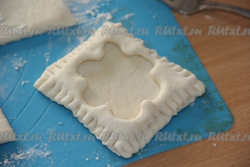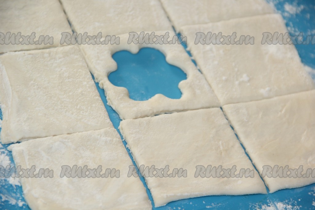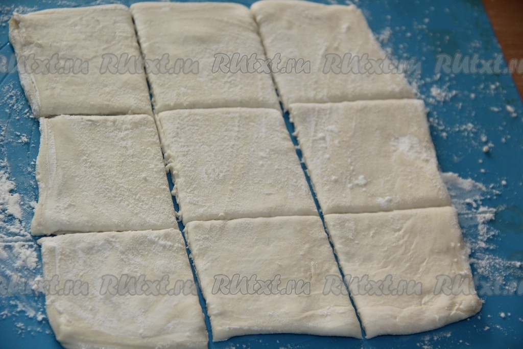 У меня покупное слоёное тесто было в виде 2 пластов. На столе, присыпанном мукой, слегка раскатать каждый пласт теста и нарезать на квадратики (я разрезала каждый пласт теста на 9 квадратов).