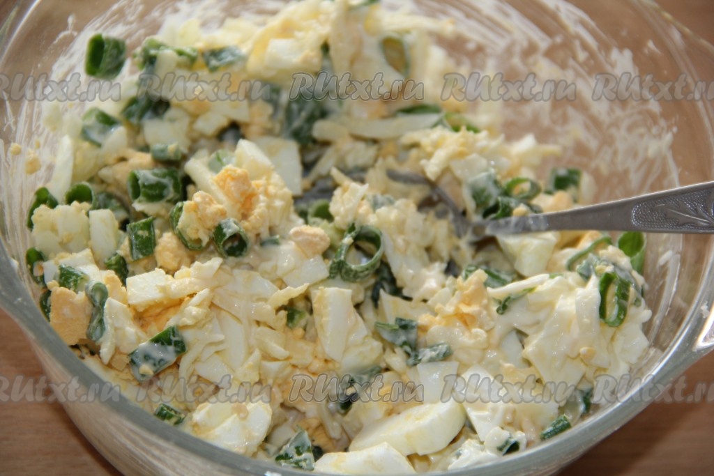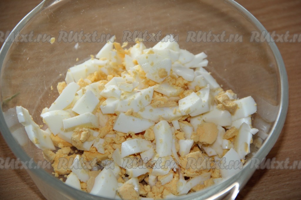 Соединить нарезанные яйца и лук, добавить натёртый на крупной тёрке сыр.