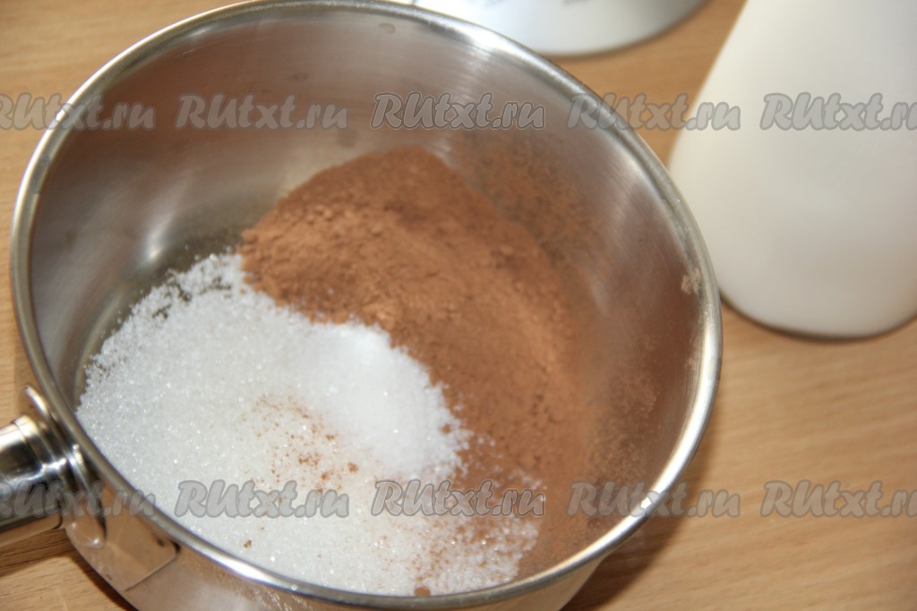 К какао и сахару влить часть молока, перемешать до однородности.