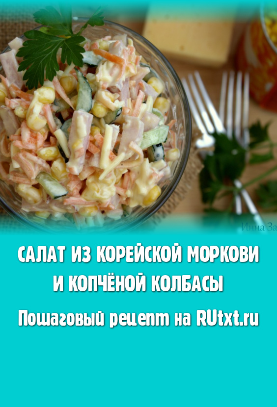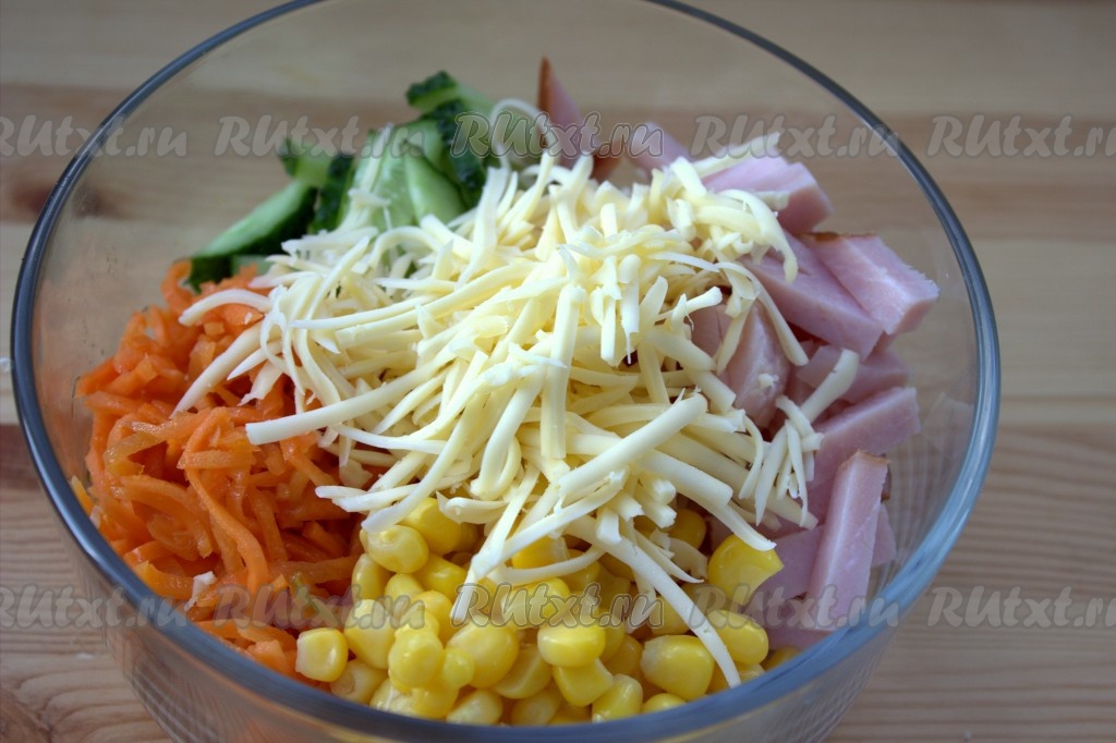 В салатнике соединить нарезанные огурец, колбасу, корейскую морковь и натёртый сыр. С консервированной кукурузы слить жидкость и добавить в салат.
