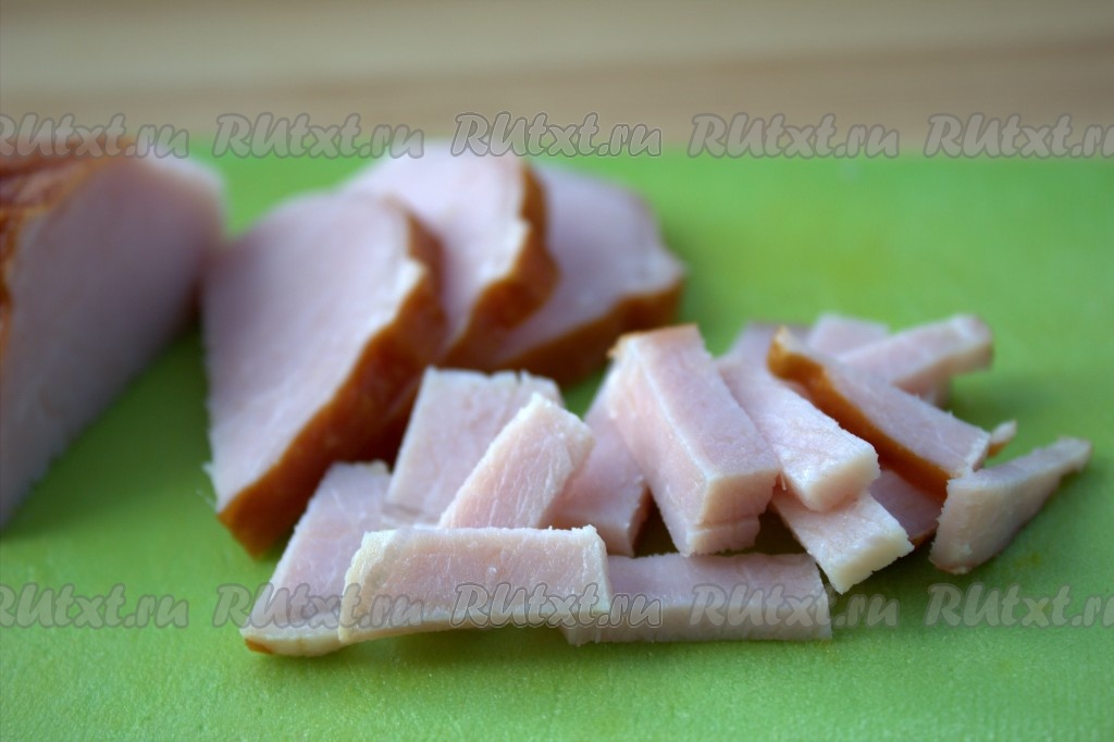 Варёно-копчёный карбонад (или любую копчёную колбасу) нарезать длинными брусочками.