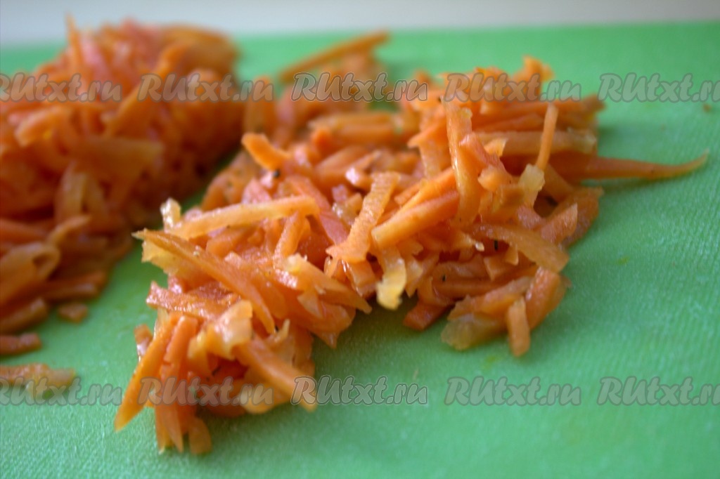 Корейскую морковь нарезать на небольшие полоски.
