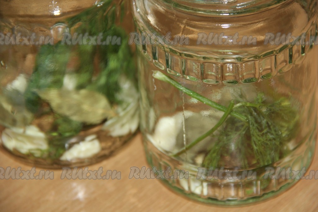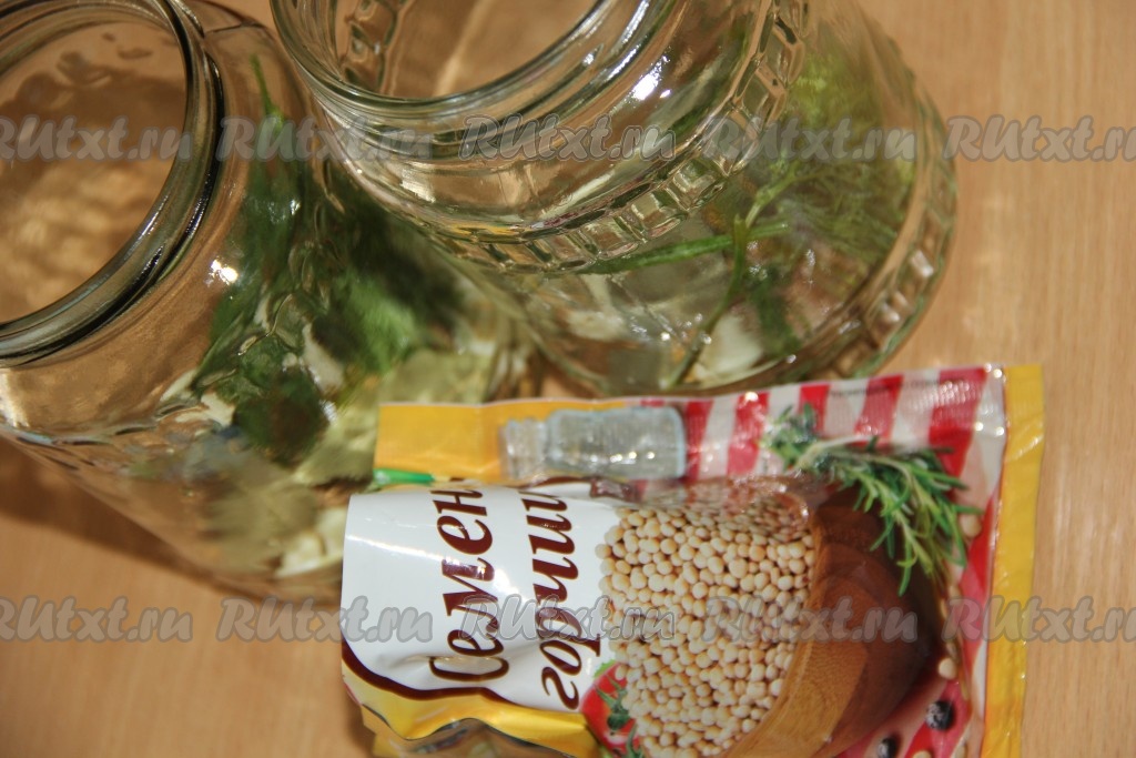Банки предварительно хорошо вымыть и простерилизовать любым способом. В каждую стерильную банку выложить 1 зонтик укропа, 2 очищенных зубчика чеснока, 1 лавровый лист, 3 горошинки чёрного перца, щепотку семян горчицы, 1 горошину душистого перца.