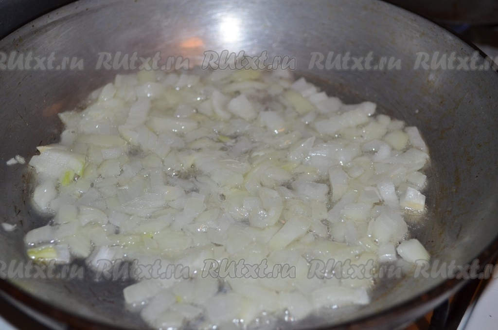 Лук мелко порезать, обжарить на оливковом масле до мягкости.