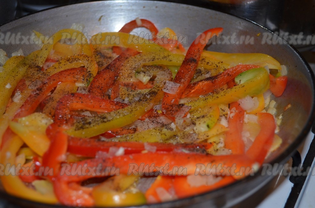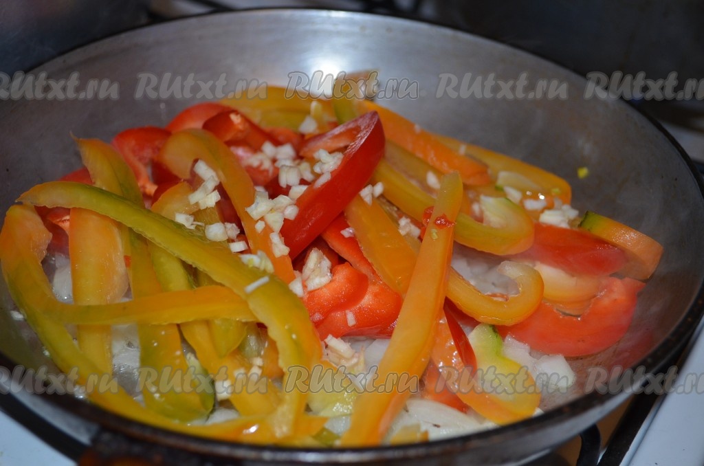 Добавить нарезанные на полоски сладкие перцы и измельченный зубчик чеснока.