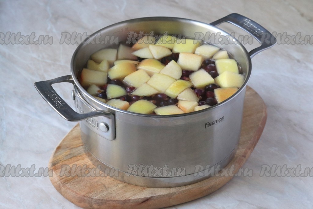 В кастрюле вскипятить воду и выложить подготовленные яблоко и смородину.