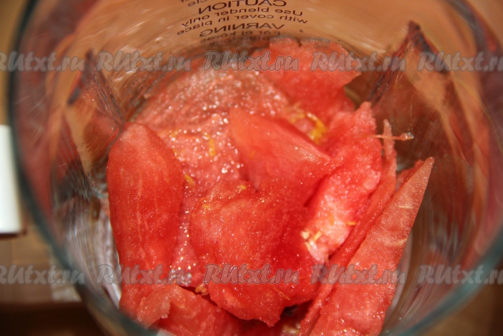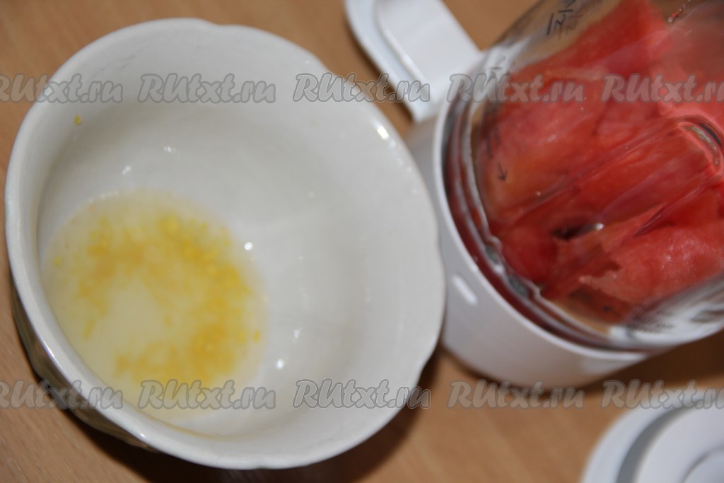 Выложить нарезанный арбуз в чашу блендера. Лимон хорошо вымыть, снять с него цедру, не затрагивая, находящийся под ней белый слой. Соединить в небольшой ёмкости свежевыжатый лимонный сок и цедру.
