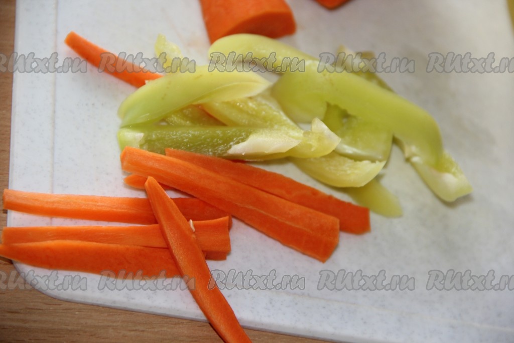 Нарезать очищенную морковь длинными брусочками. Из сладкого болгарского перца удалить все семена, а затем нарезать длинными полосками.