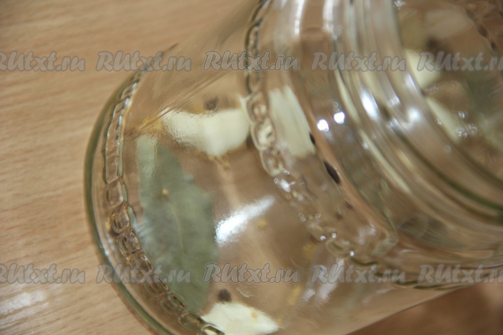 Вымыть и простерилизовать банки любым удобным способом, крышки прокипятить. На дно каждой банки выложить 3 очищенных зубчика чеснока, лавровый лист, 5 горошинок чёрного перца, щепотку семян горчицы.