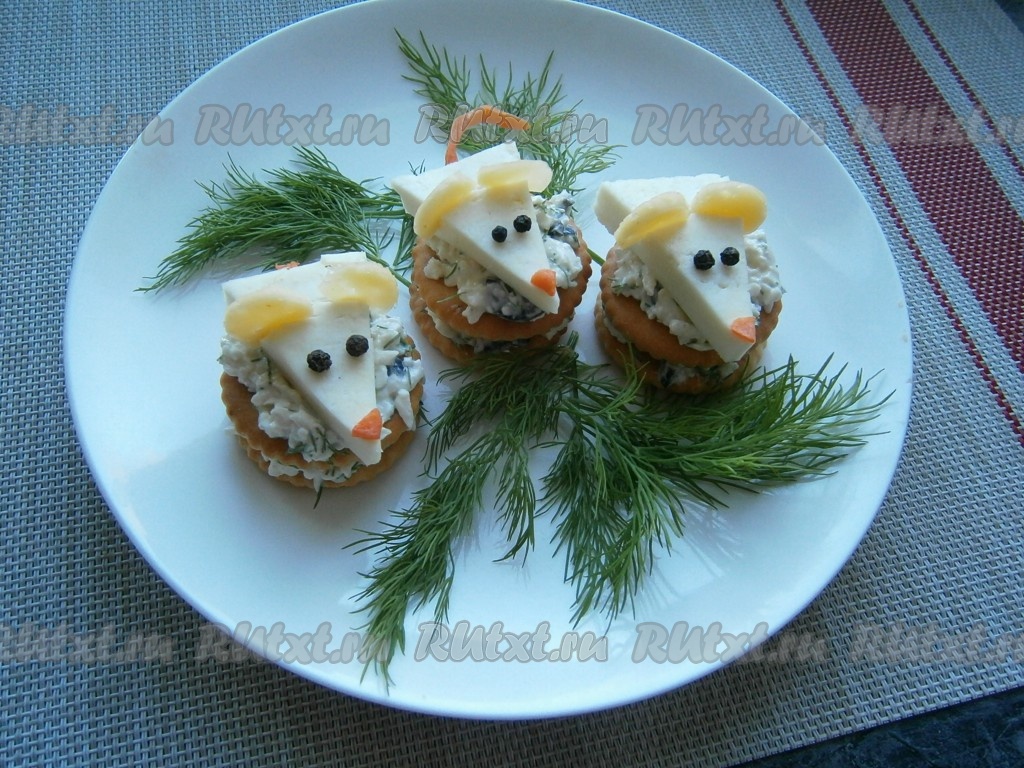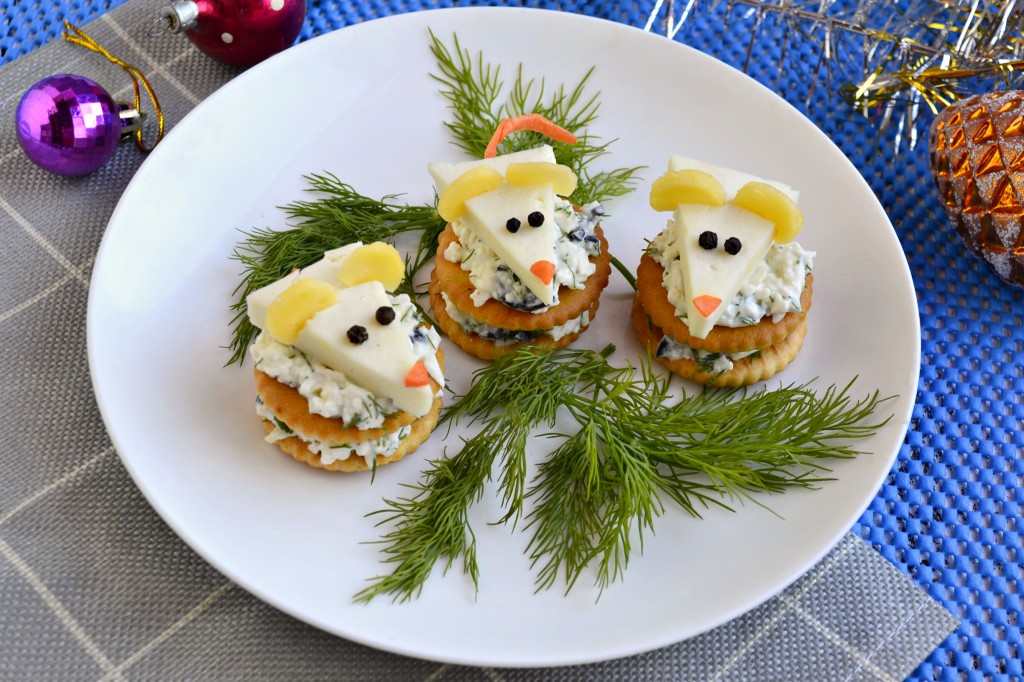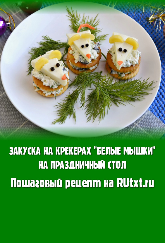 Очень вкусная, аппетитная, яркая новогодняя сырная закуска на крекерах "Белые мышки" готова, можно подавать на праздничный стол!