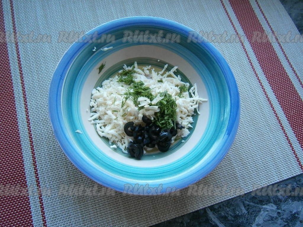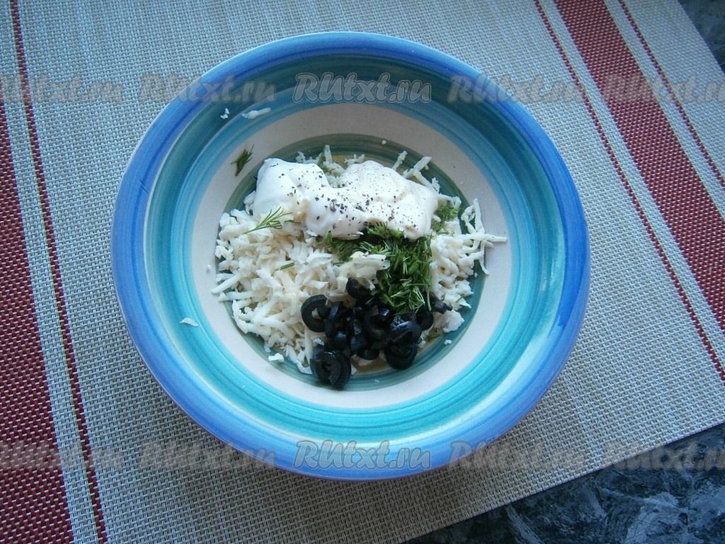Остатки сыра натереть на средней тёрке. Добавить нарезанные колечками (или полуколечками) оливки, измельчённый укроп и пропущенный через пресс чеснок.