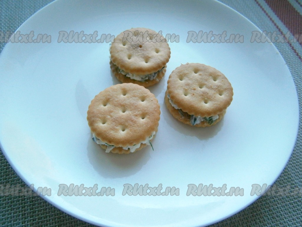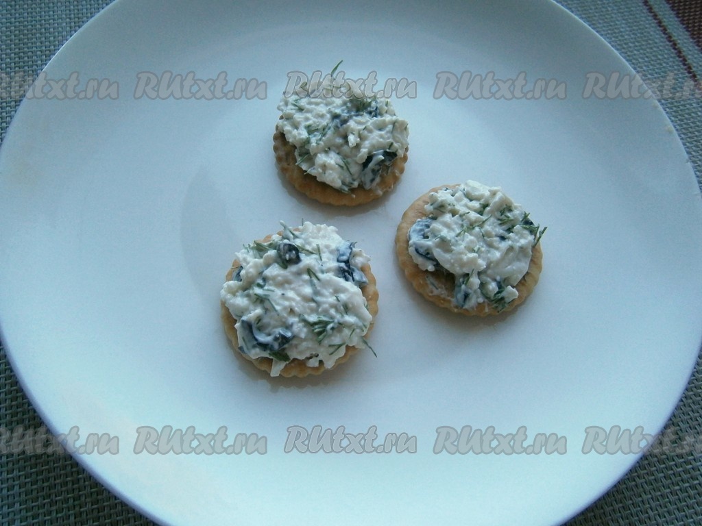 Тщательно перемешать получившуюся сырную массу. Выложить половину сырной массы на 3 крекера.