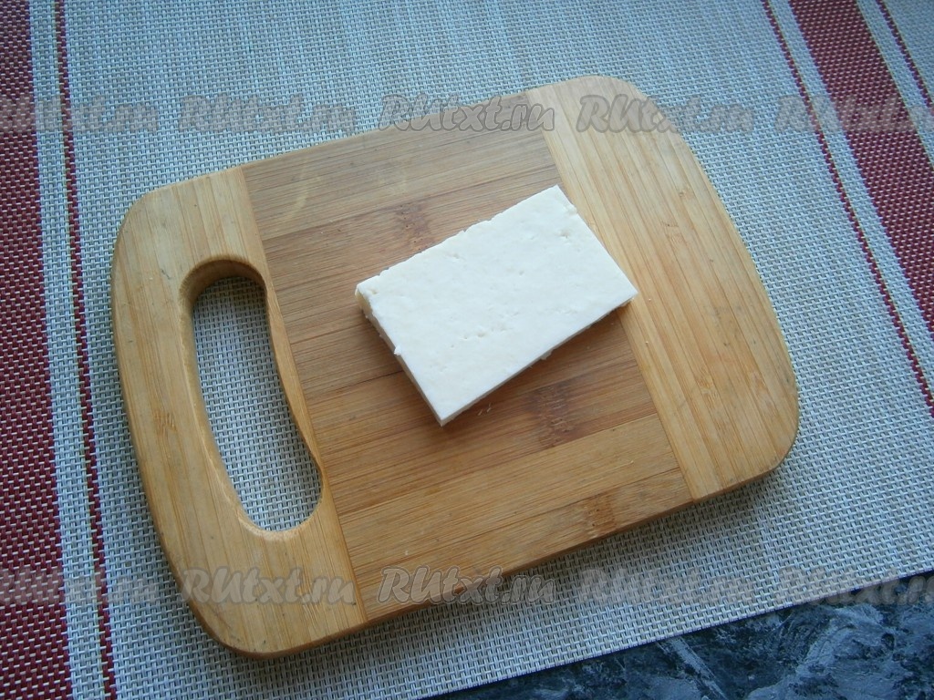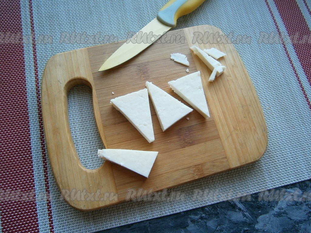 Готовится эта закуска очень просто. Отрезать ровный прямоугольный кусок сыра.