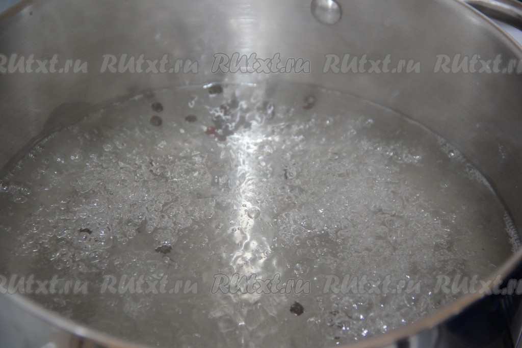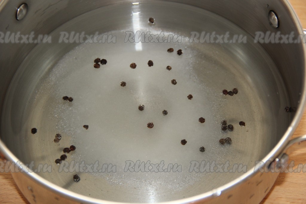 Для приготовления маринада соединить в кастрюле воду, горошинки чёрного перцы, сахар и соль.