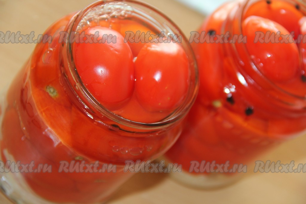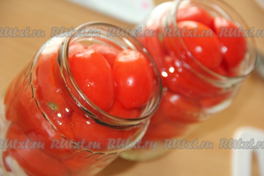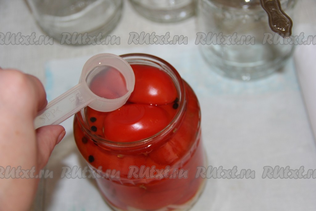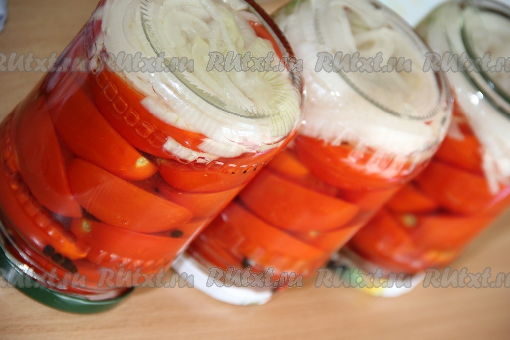 Залить банки с помидорами и луком горячим маринадом до краёв.