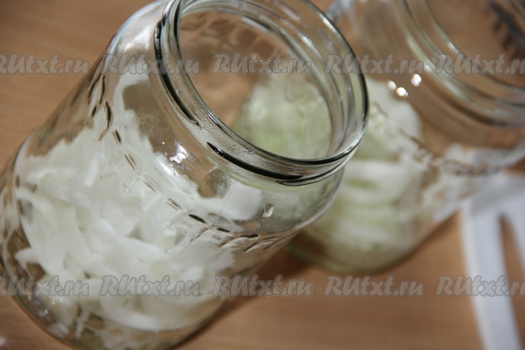 Лук очистить и нарезать колечками (или полукольцами). В чистые и стерильные банки выложить лук. Я равномерно разделила две луковицы на три банки.