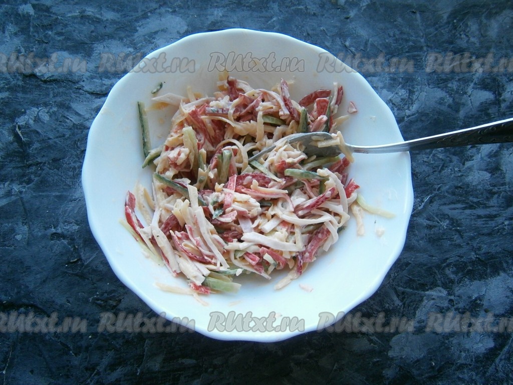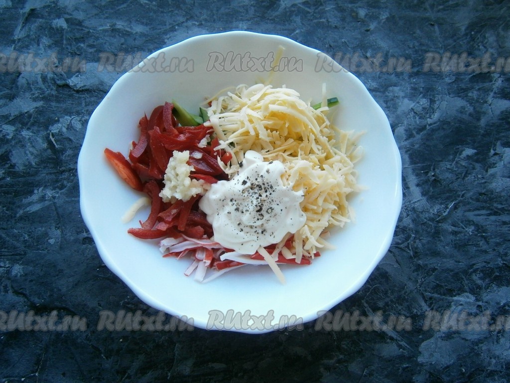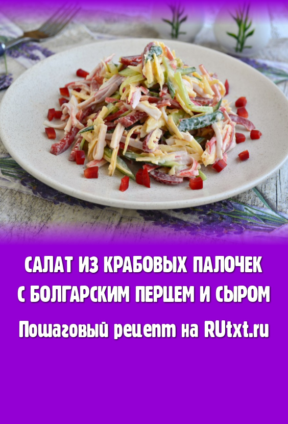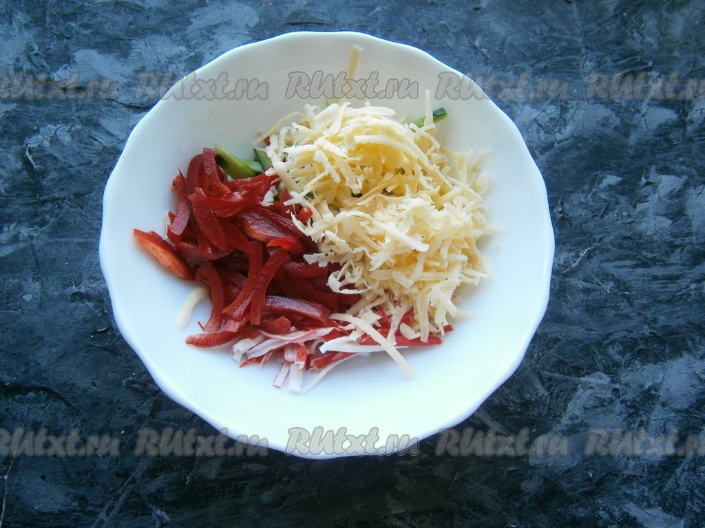 Болгарский сладкий перец очистить от семян и тоже нарезать тонкой соломкой, а затем вместе сыром, натёртым на крупной тёрке, выложить в салат из огурцов и крабовых палочек.