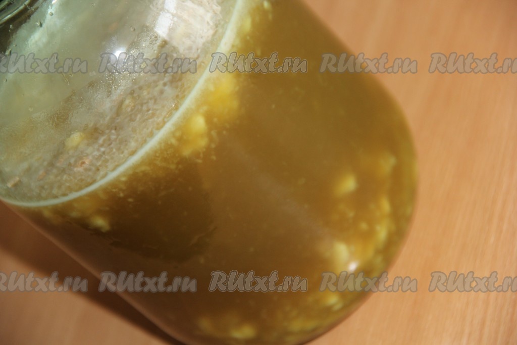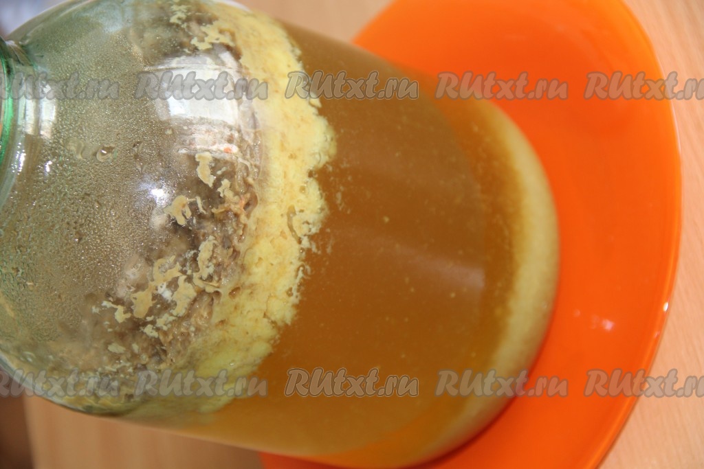 Оставить квас на кухонном столе на 2 суток (можно прикрыть верх банки марлей). Вот так выглядит банка на вторые сутки.