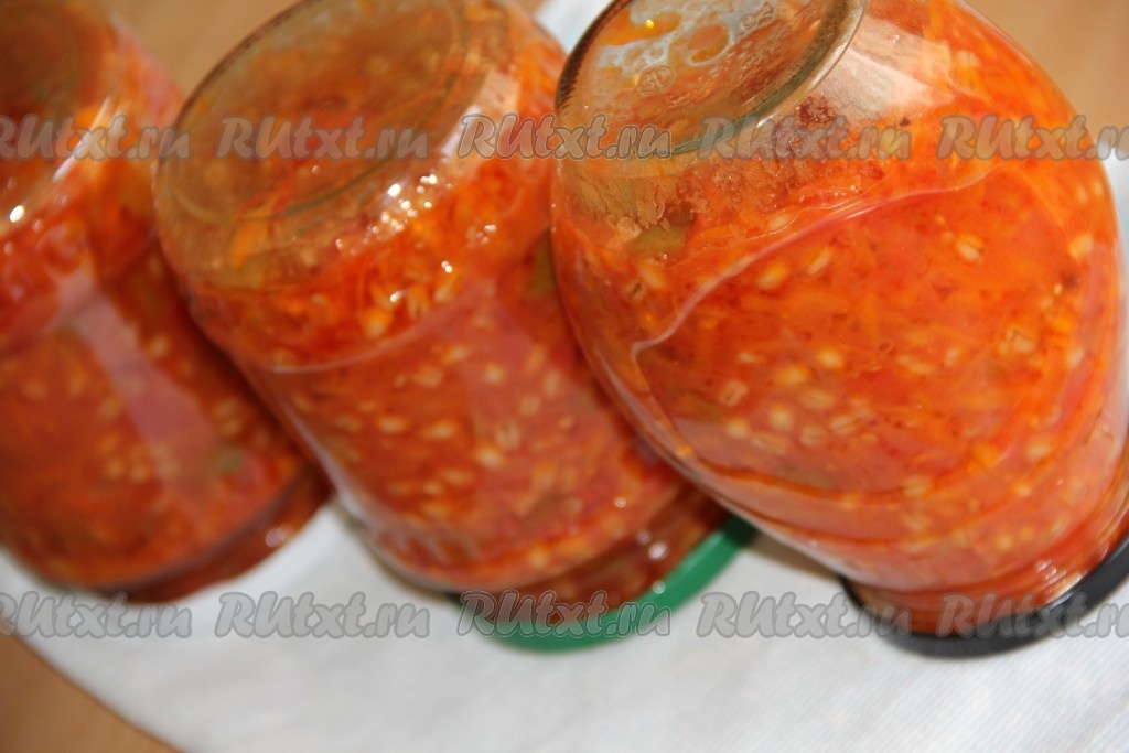 Банки предварительно вымыть и простерилизовать любым способом. Разложить горячий салат по банкам.