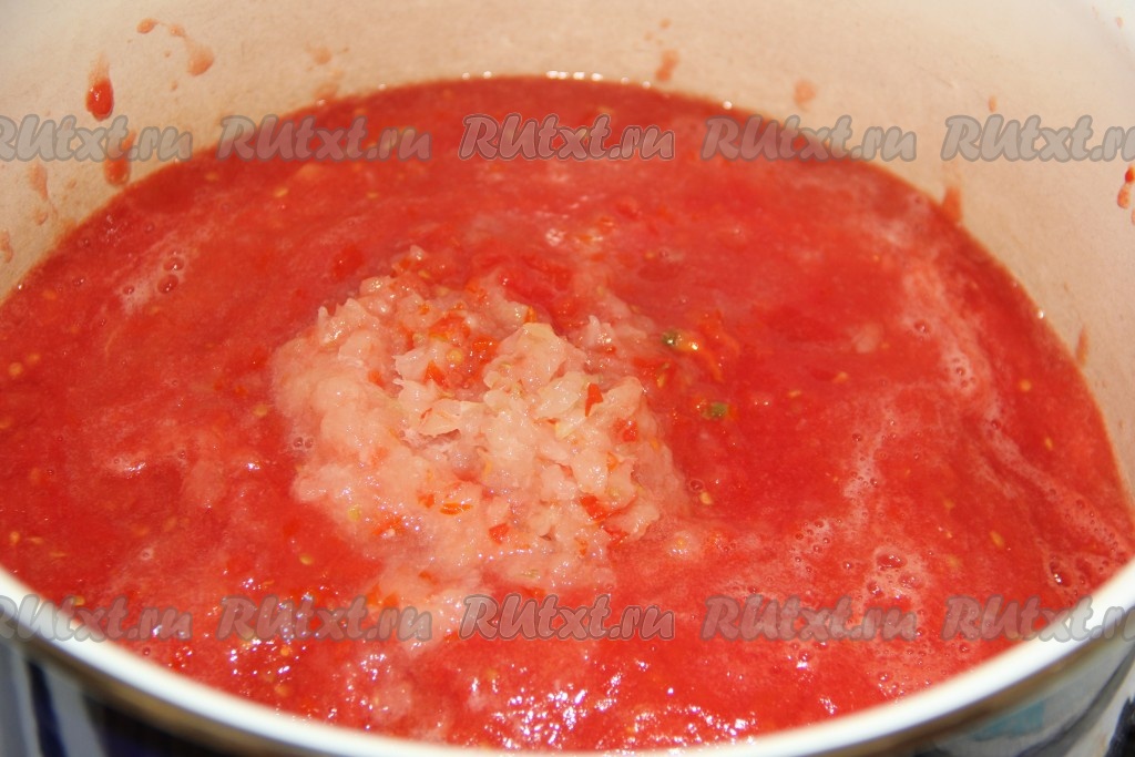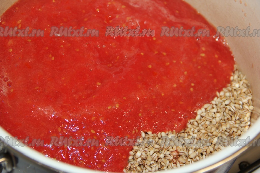 Помидоры вымыть, пропустить через мясорубку, выложить в кастрюлю, добавить промытую перловую крупу.