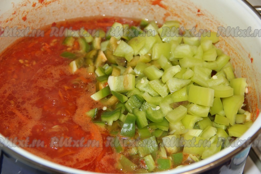 Нарезать болгарский перец небольшими кусочками, выложить в кастрюлю и перемешать.