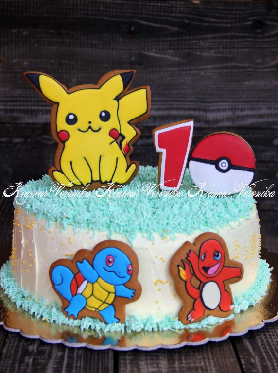 Обмазать верхний корж взбитыми сливками и поставить в холодильник на ночь. Теперь приготовим чиз-крем для украшения, для этого нужно взбить оставшиеся 100 мл сливок, смешать с творожным кремом и с сахарной пудрой. Частью чиз-крема смазать бока торта "Пиньята". Оставшийся крем подкрасить любым пищевым красителем (у меня ушло 2 капли гелевого красителя для окрашивания травки) и украсить торт. Я украсила торт ещё и имбирными пряниками.