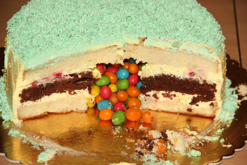На фото видно, как торт "Пиньята" с сюрпризом выглядит в разрезе. Приготовьте этот вкусный, красивый тортик и порадуйте себя и своих близких замечательной выпечкой!