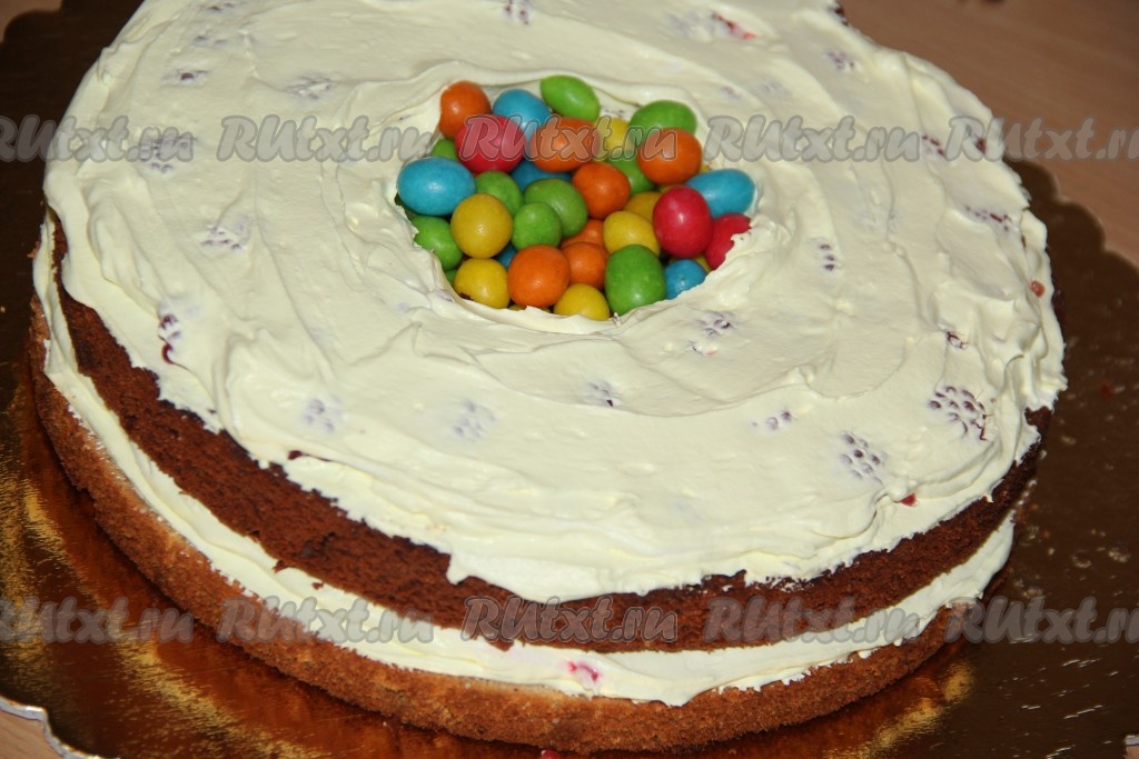 Пропитать корж сиропом, серединку не пропитывать, чтобы конфетки не намокли.