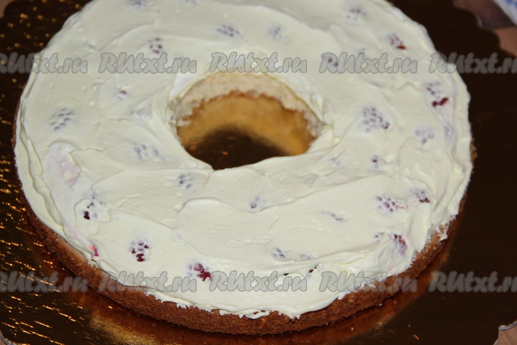 Покрыть корж кремом, выложить малину и опять смазать кремом. Край внутри коржа не смазывать!