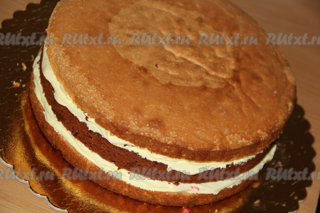 Накрыть второй частью ванильного (белого) коржа и слегка прижать.