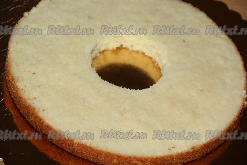 На подложку выложить одну часть белого бисквита и сделать с помощью стакана в середине отверстие. Пропитать этот бисквит любой пропиткой. Я пропитала медовым сиропом. Для приготовления медового сиропа я соединила 500 мл воды и 100 мл мёда - этого количества мне хватило для пропитки всего торта.