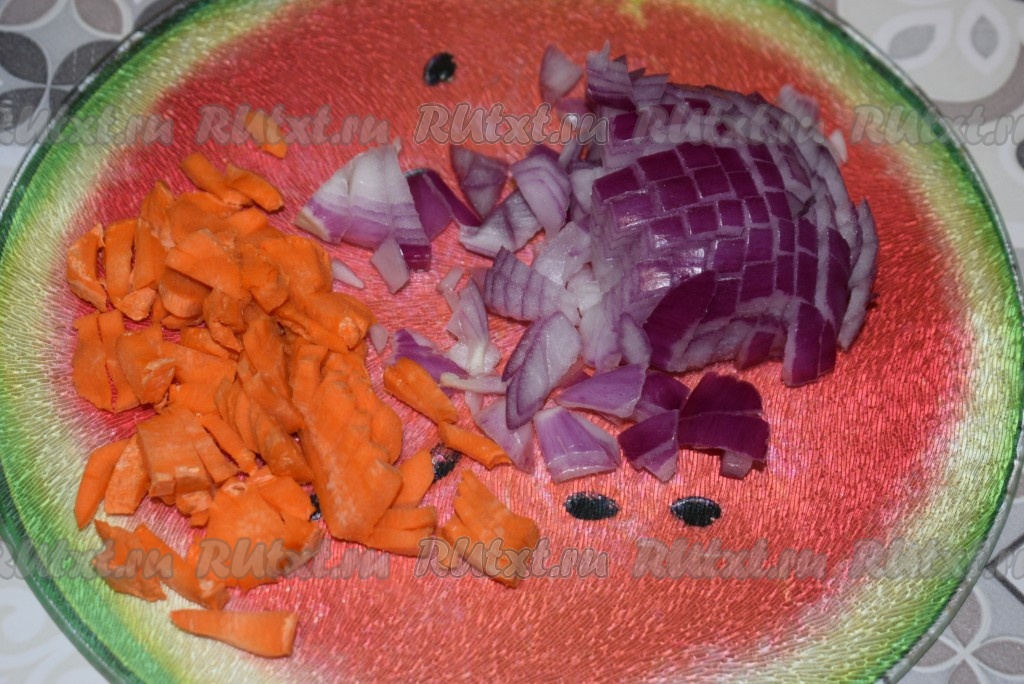 Пока варится сёмга, очистим картофель, промоем его и нарежем на крупные кусочки. Лук и морковь очистим от кожуры и нарежем мелкими кубиками.