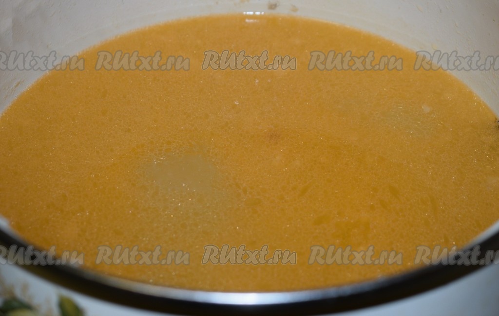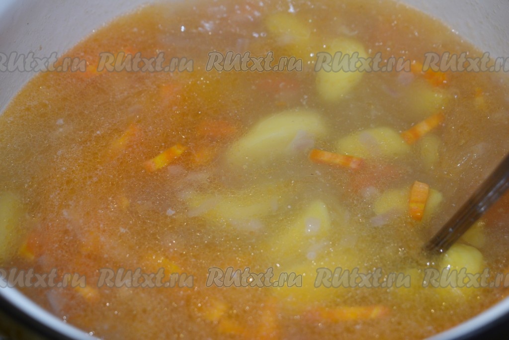 В процеженный бульон кладём нарезанные картошку, лук и морковь. Доводим бульон до кипения, уменьшаем огонь и варим овощи до готовности (примерно, 25 минут). Время варки зависит от готовности картофеля - чем крупнее он будет нарезан, тем больше времени понадобится.