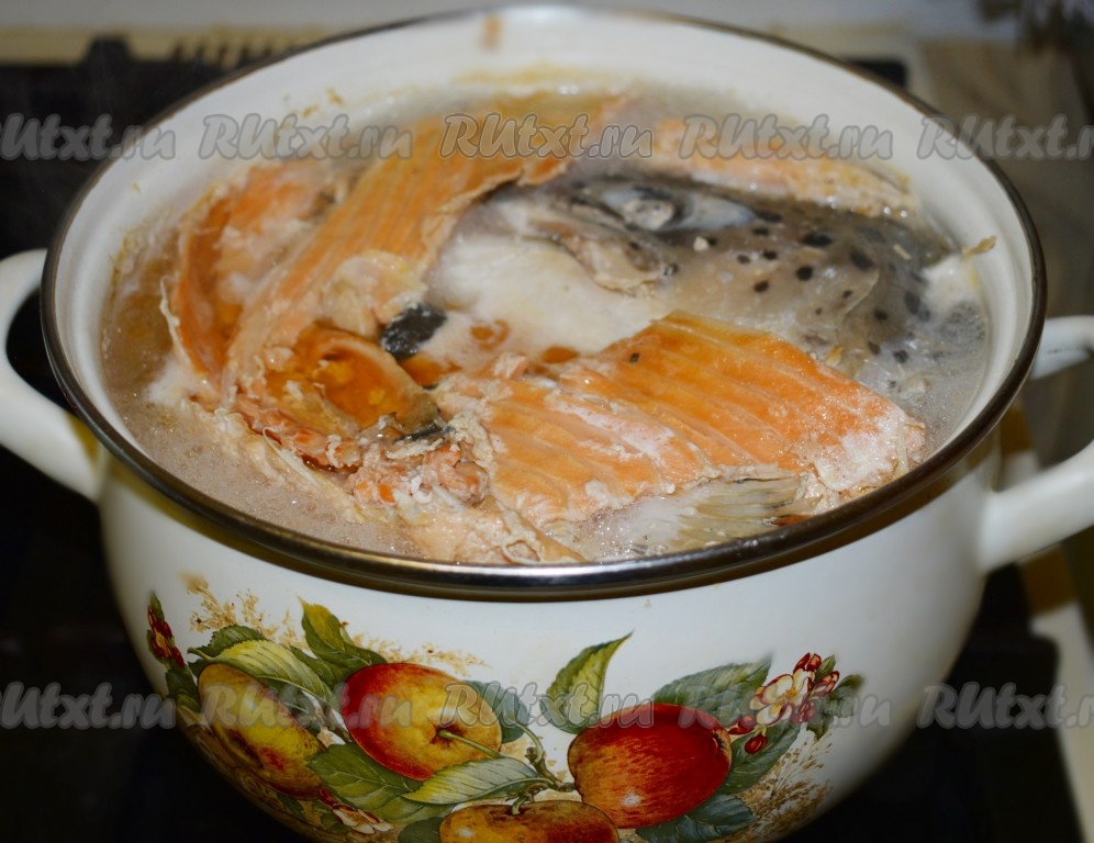 Суп будем готовить из остатков сёмги (у меня была большая рыба размером 7-8 кг), которые мы не смогли пустить на филе (голова, хвост, хребты, брюшки, рёбра). Из головы удаляем жабры, нарезаем хребет на средние кусочки. Складываем подготовленные куски семги в кастрюлю с холодной водой, добавляем 1 очищенную луковицу. Ставим кастрюлю на огонь, доводим воду до кипения, снимаем пену с бульона. Делаем огонь самым слабым и продолжаем варить рыбный бульон, примерно, 30-40 минут (до полной готовности сёмги).