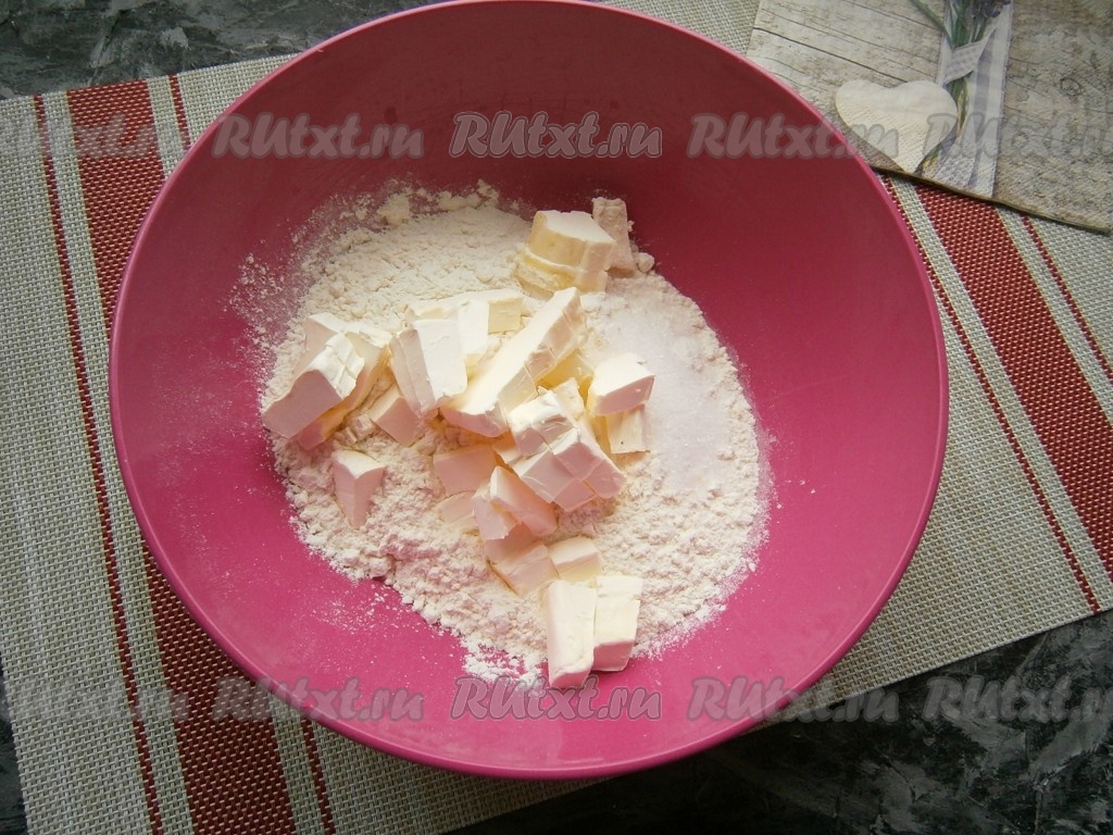 Муку смешать с солью, разрыхлителем и ванильным сахаром, добавить нарезанное на небольшие кубики сливочное масло (можно натереть на крупной тёрке), перетереть руками до получения масляно-мучной крошки.
