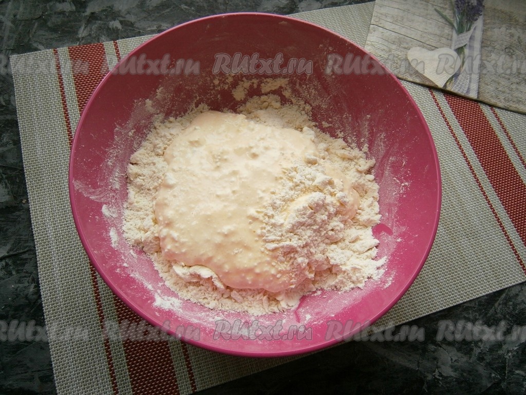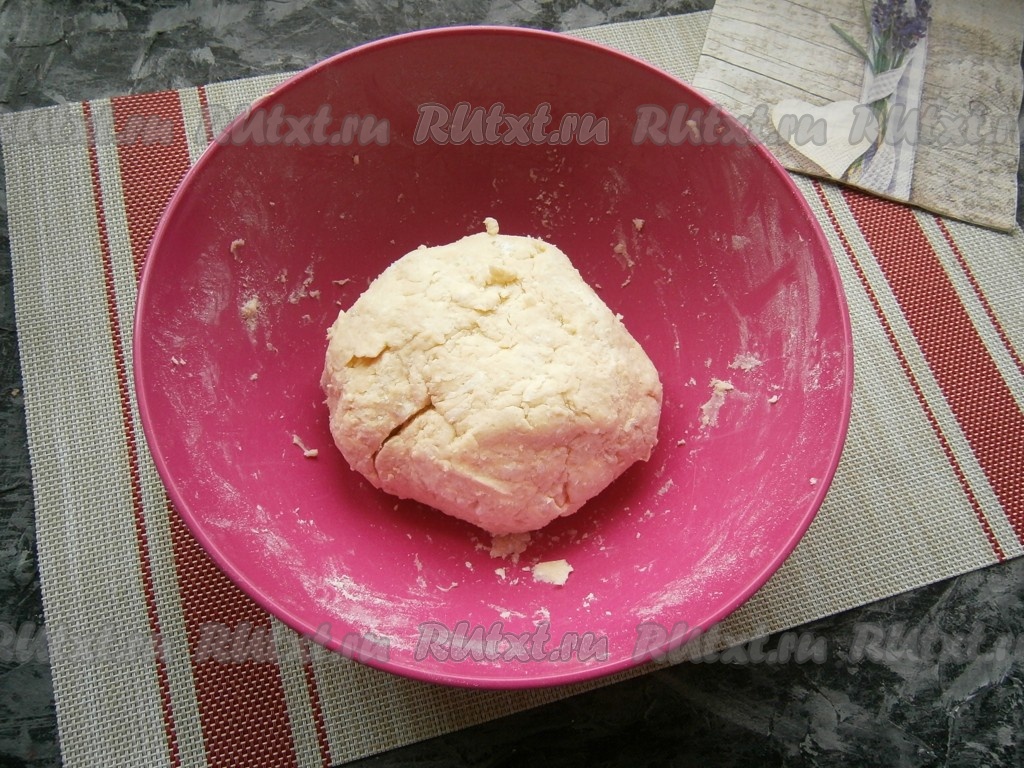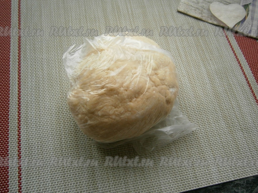 Замесить достаточно плотное тесто, которое вначале будет рассыпаться, но затем отлично соберётся в ком.